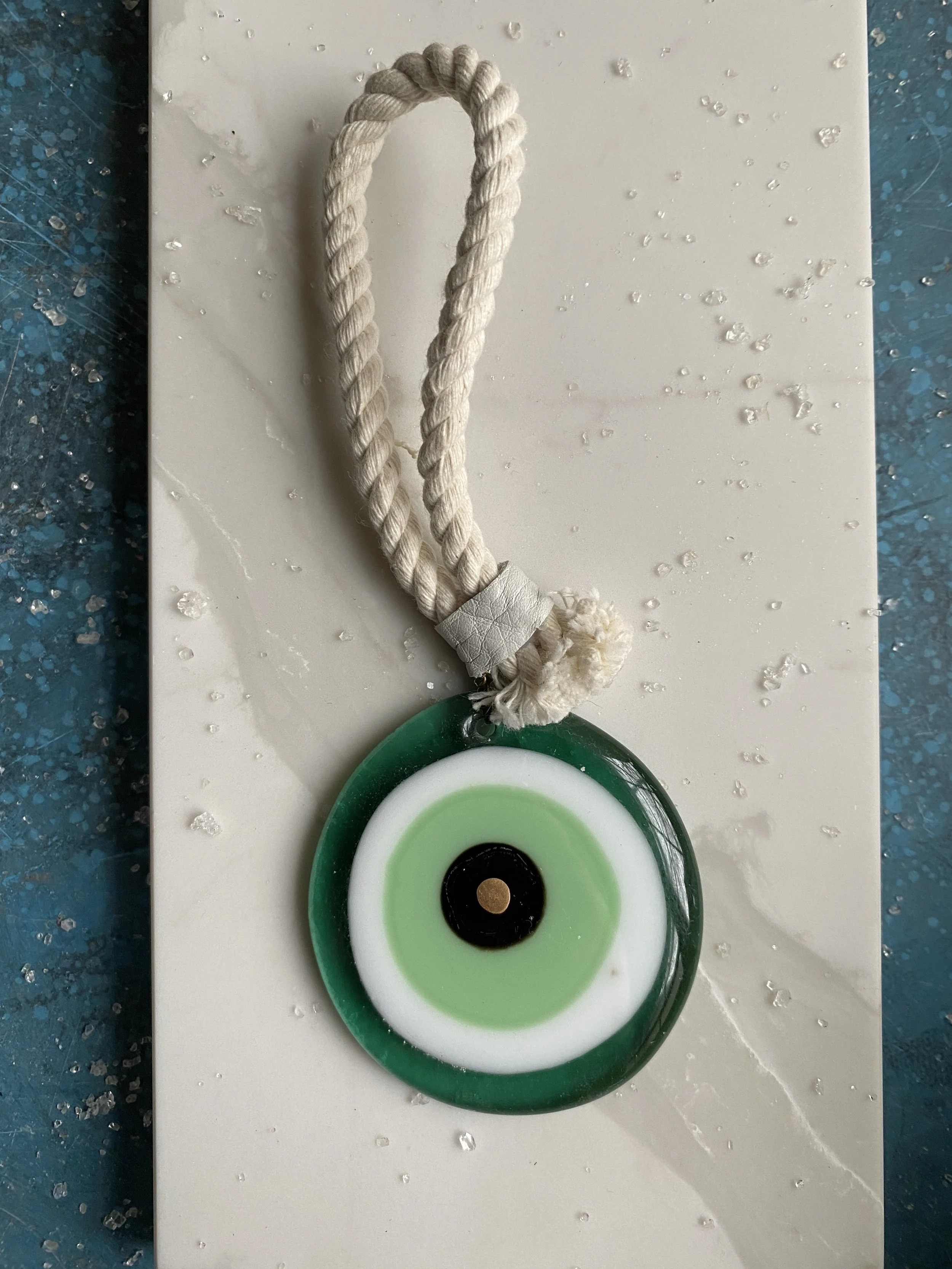 Handmade glass evil eye Mati Greek energetic protection amulet handmade by Depy Zepo in Chicago. One of a kind, unique, catches light beautifully - hang on your walls, in your windows, anywhere you need a boost of good luck and charm. Sky’s the limit babes, this handmade glass object is meant to bring you peace of mind and clarity of conviction. May it bring you and yours good health & wellness and energetic protection!