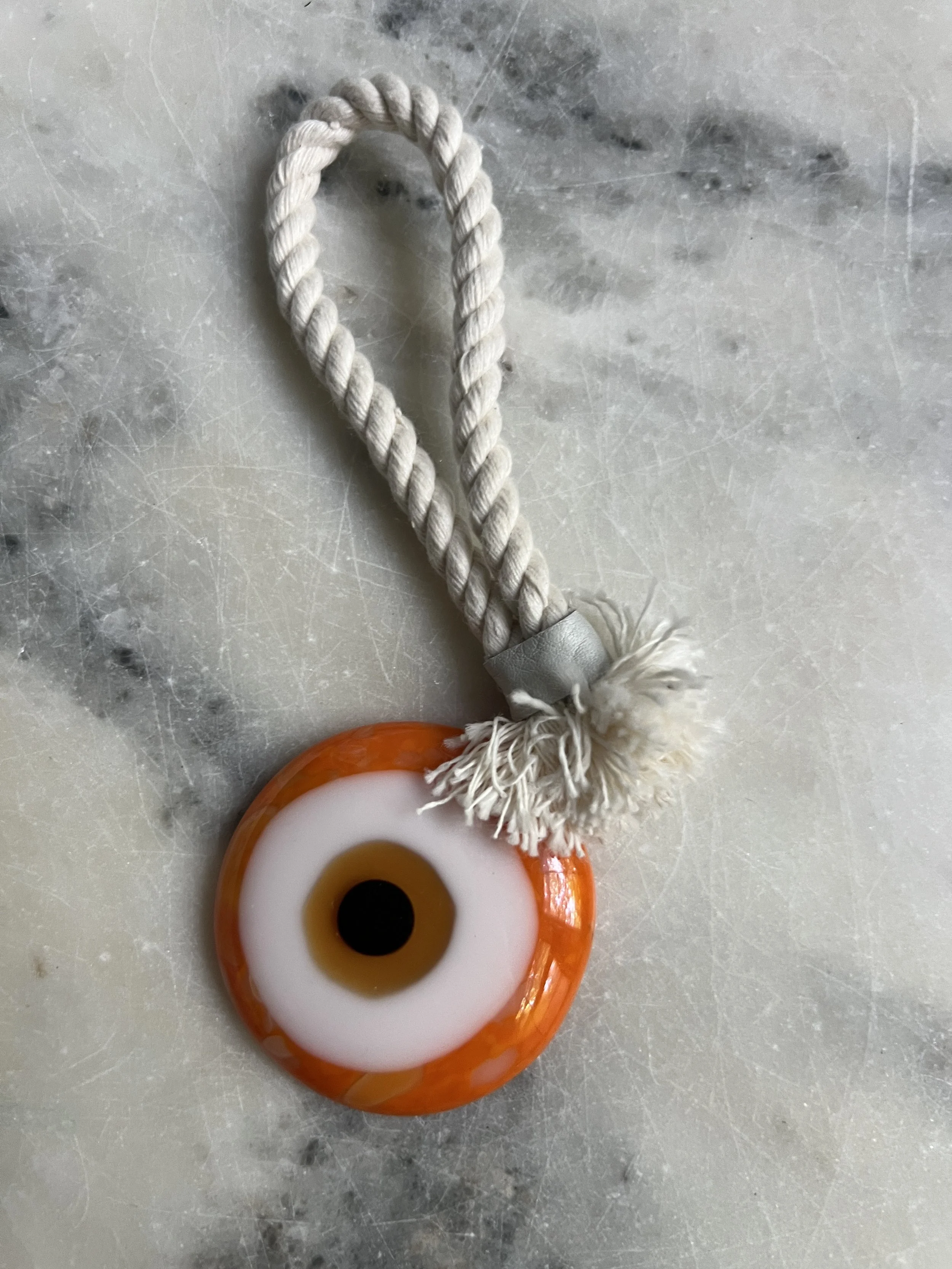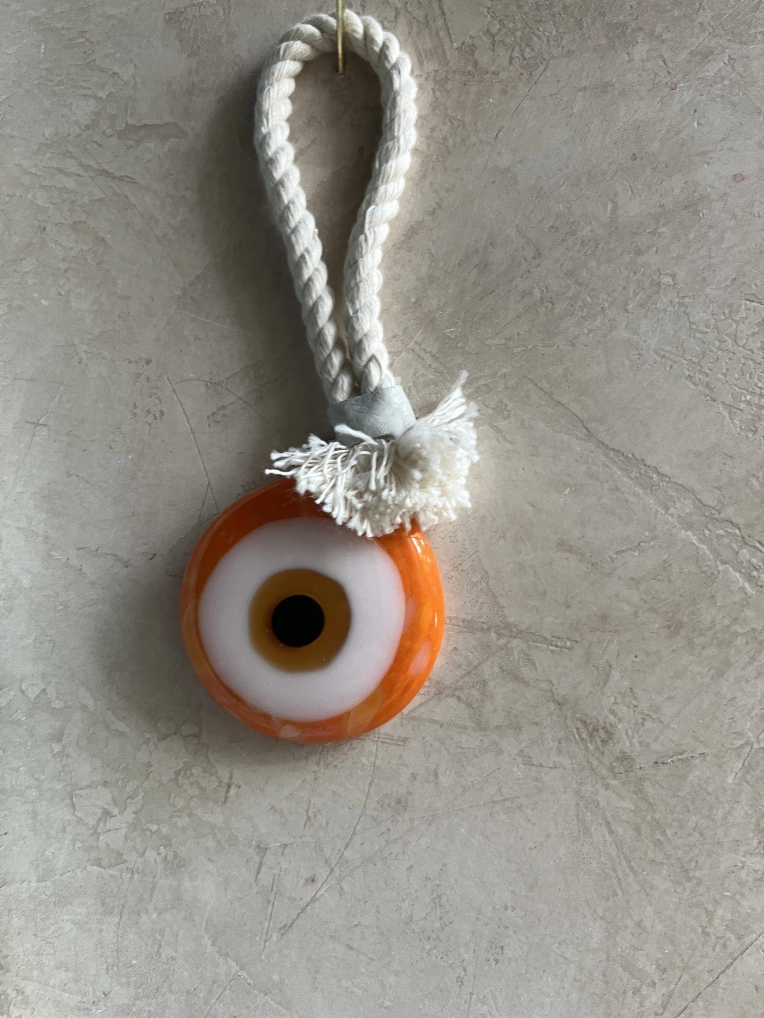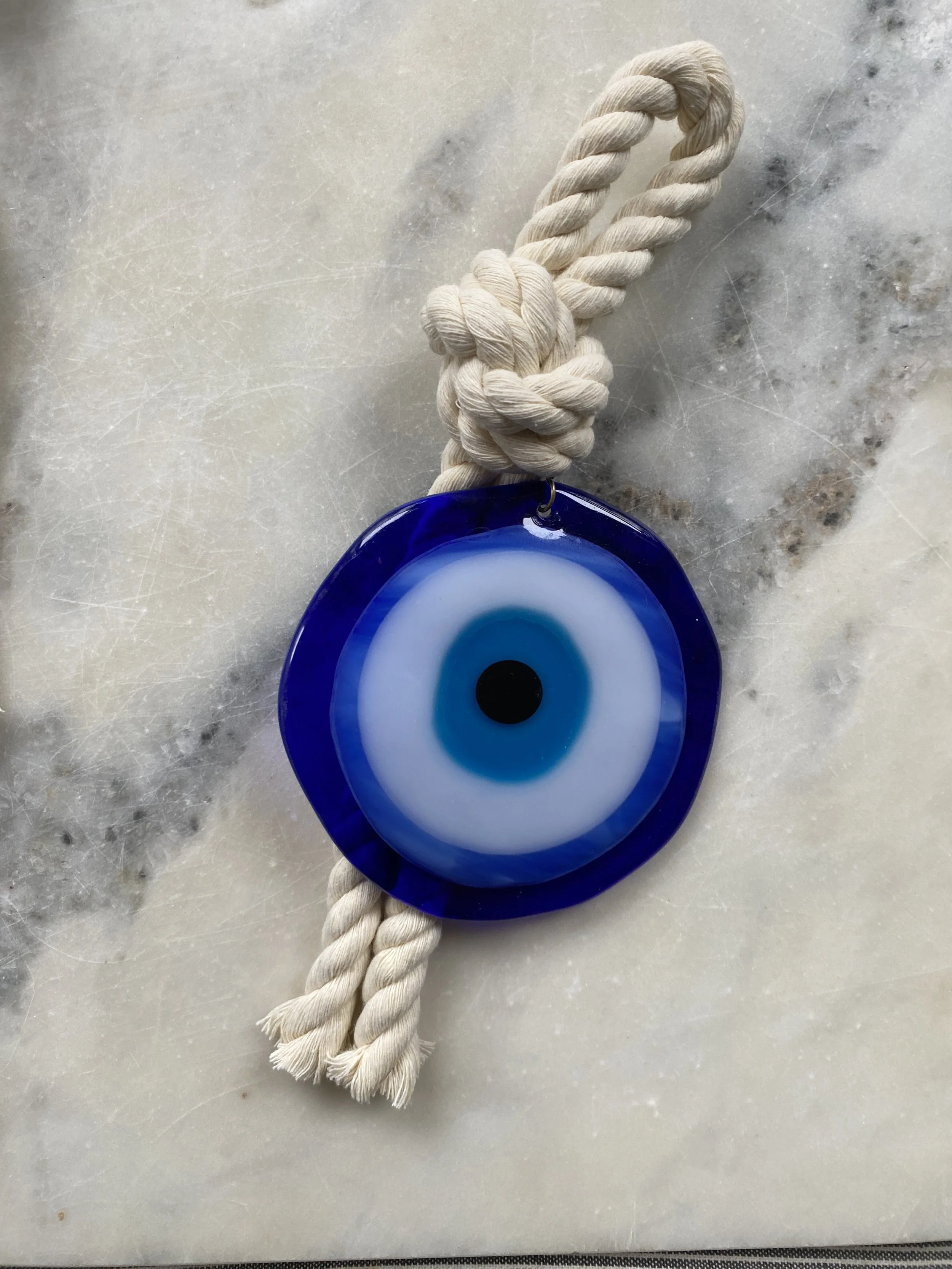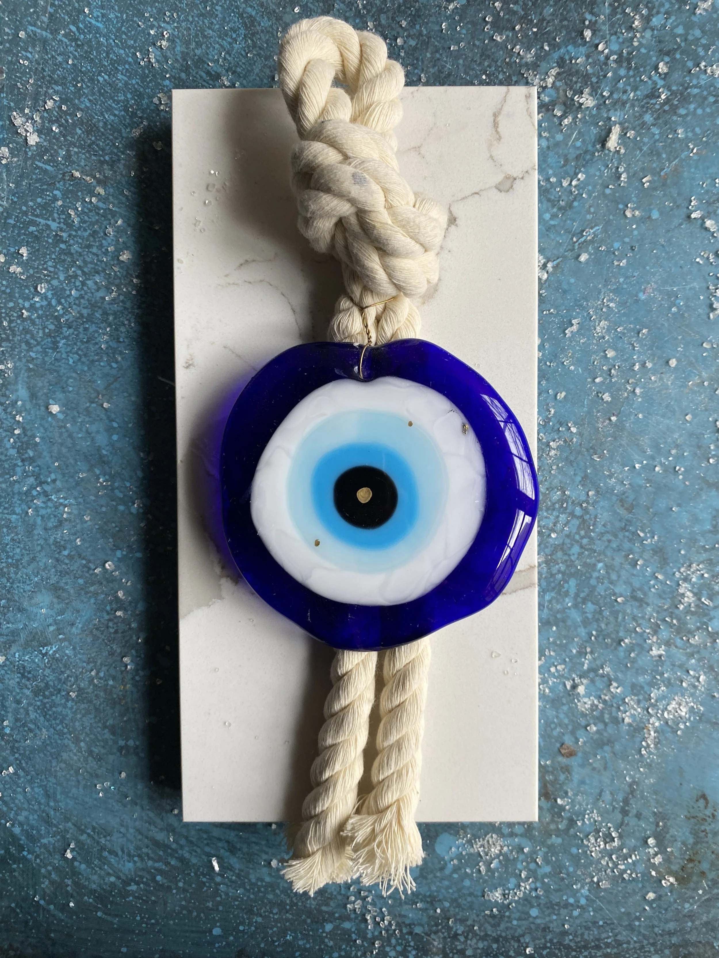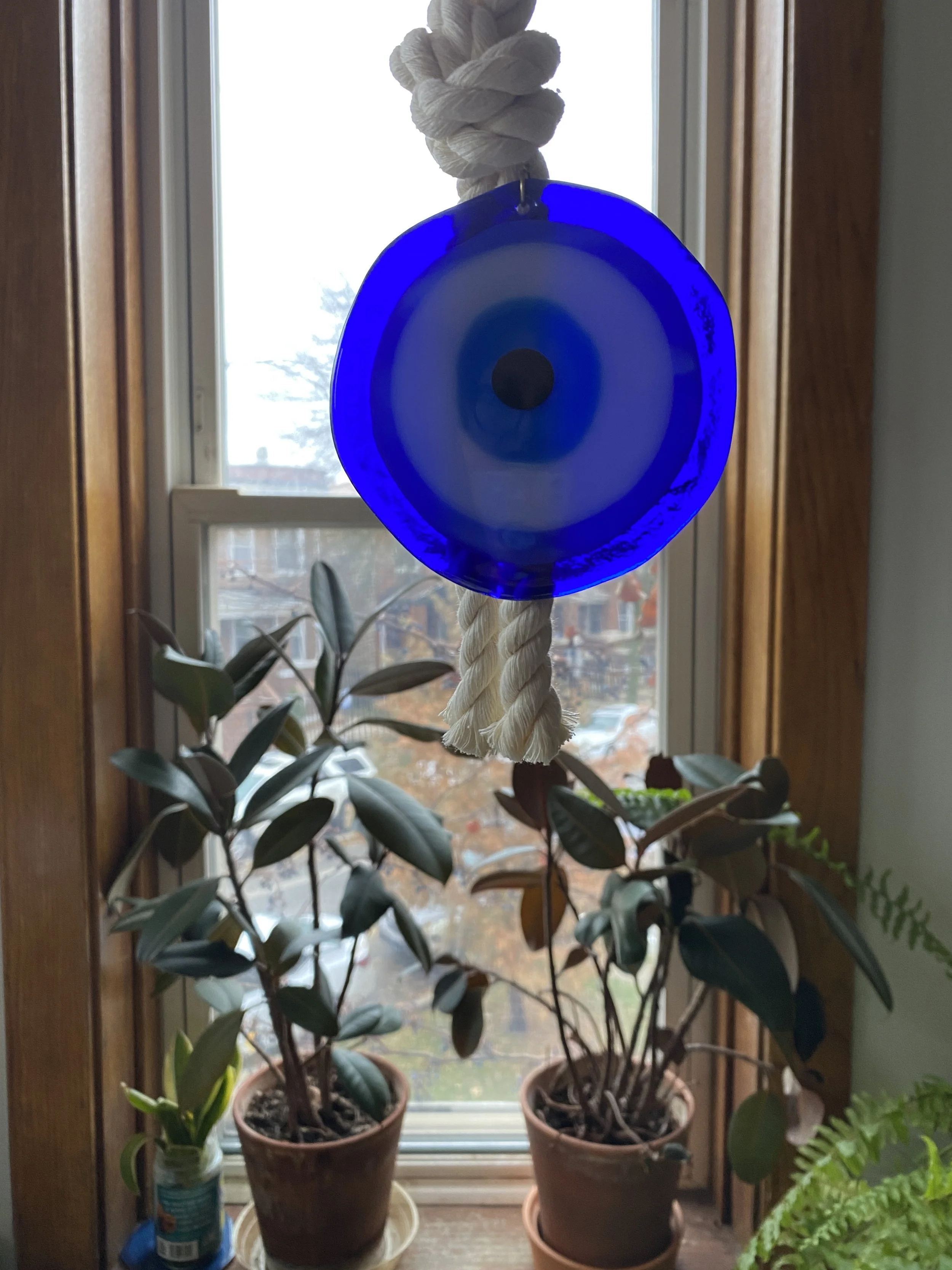 Handmade glass evil eye Mati Greek energetic protection amulet handmade by Depy Zepo in Chicago. One of a kind, unique, catches light beautifully - hang on your walls, in your windows, anywhere you need a boost of good luck and charm. Sky’s the limit babes, this handmade glass object is meant to bring you peace of mind and clarity of conviction. May it bring you and yours good health & wellness and energetic protection!