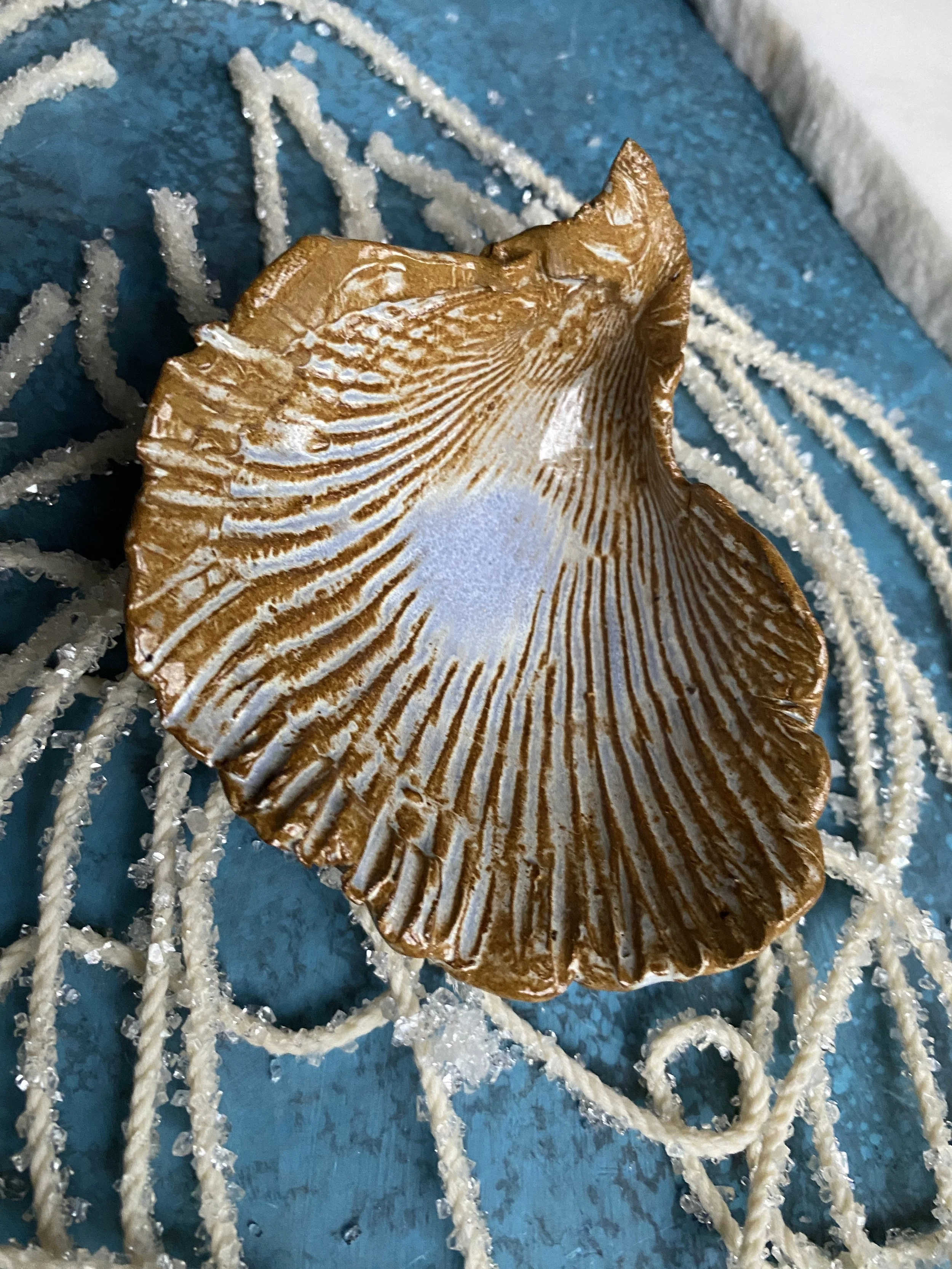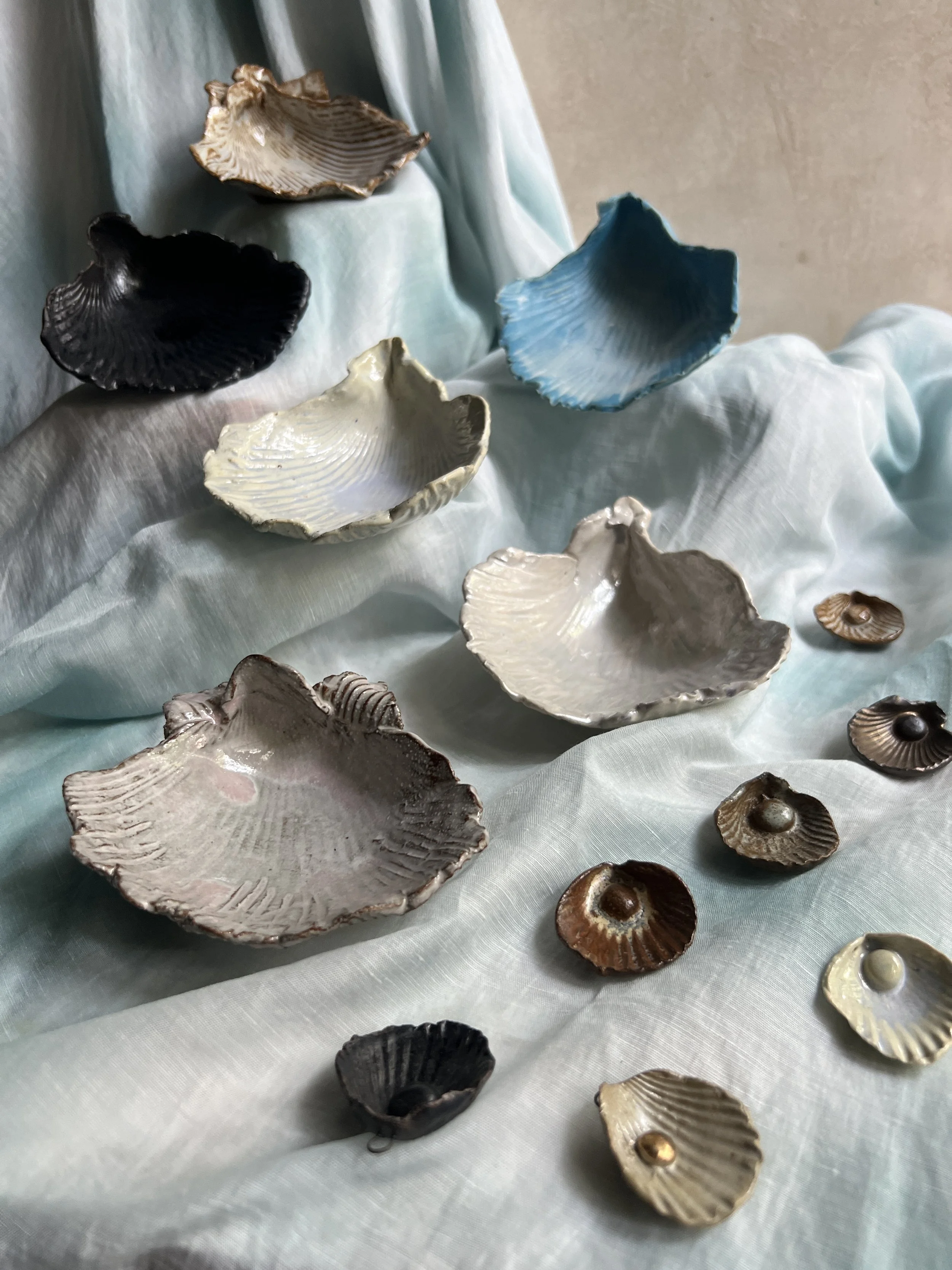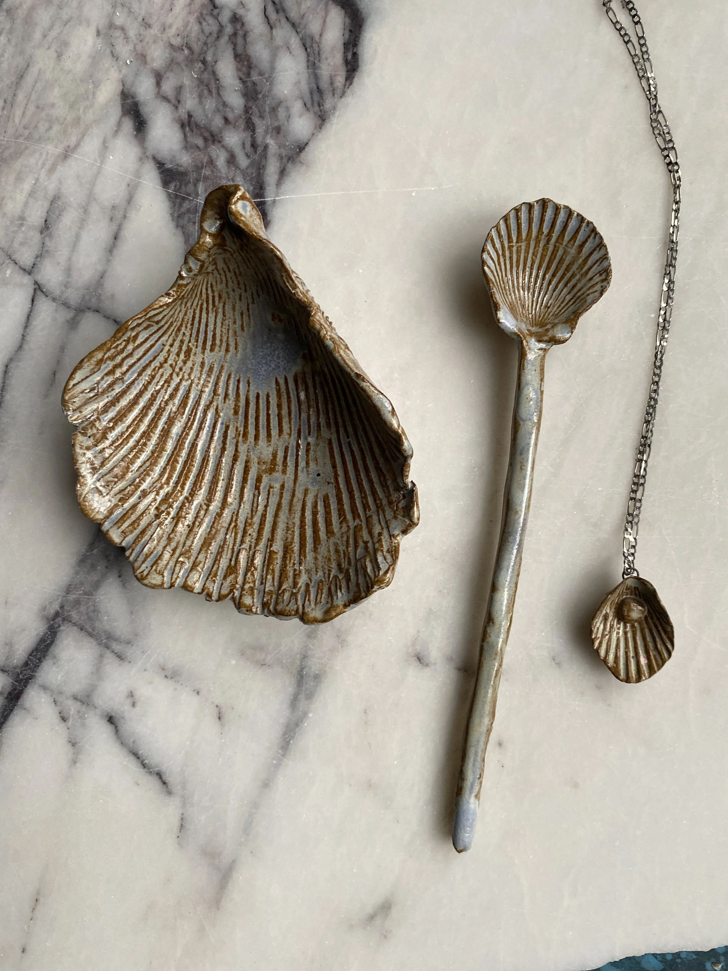 Dimensions are: Oval Platter 9”, Dessert Plate 8”, Scoop Spoons 6-8”, Golden Hand Dish 7”, Small Kylix 6”, Side Dish 5”, Shell Dish 4”, Ramkein 3”, Salt Dish 2.5”